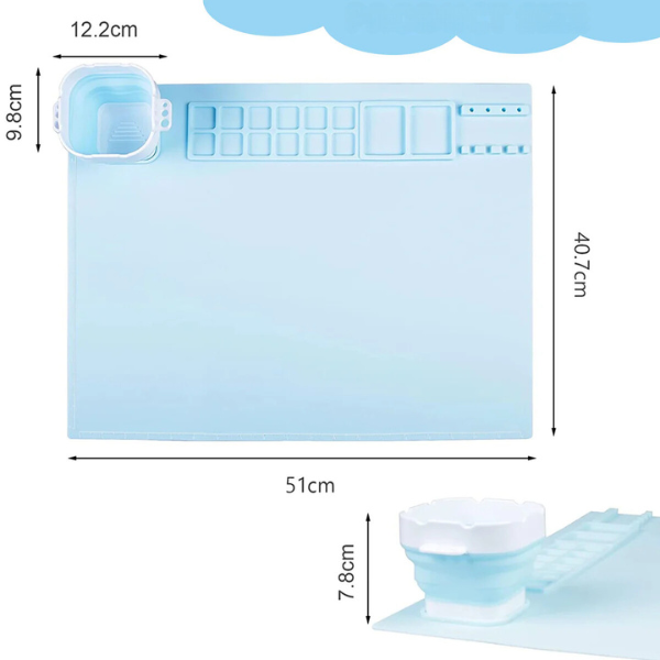 Preșul de vopsit din silicon are o cupă pliabilă, suport pensule, spațiu pentru 14 culori și o paletă de vopsele deci puteți crea în cel mai confortabil mod și puteți fi inspirat fără probleme.