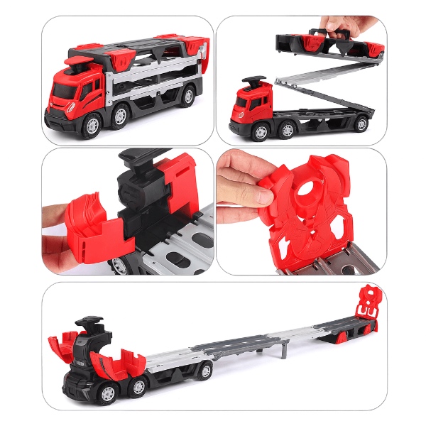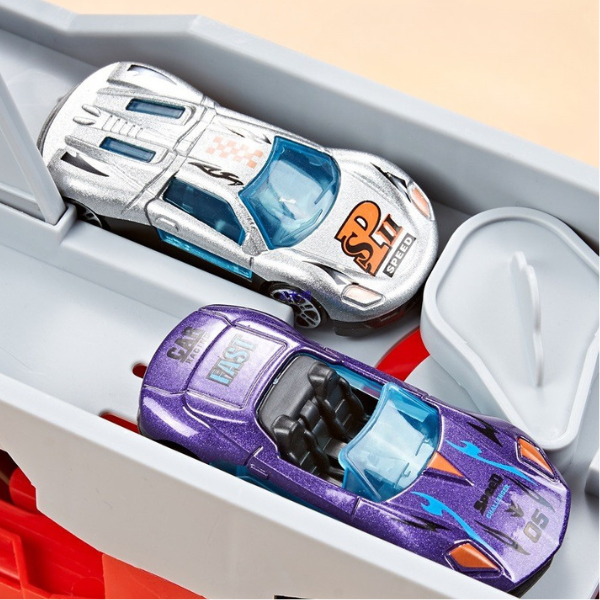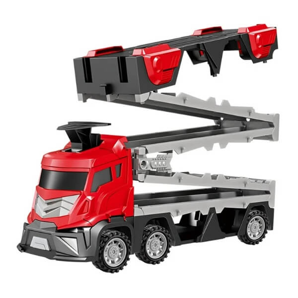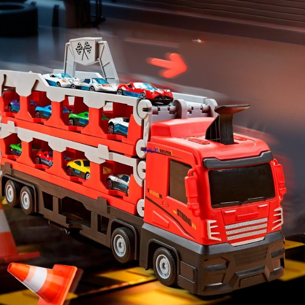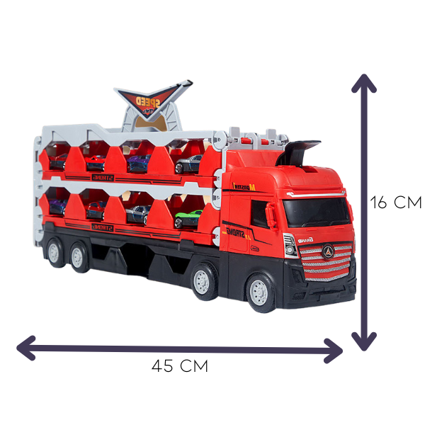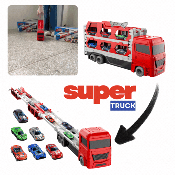 Super Camionul cu Mașinuțe are o rampă care permite lansarea simultană a două mașinuțe. Oferă distracție nelimitată și spirit competitiv între copii.